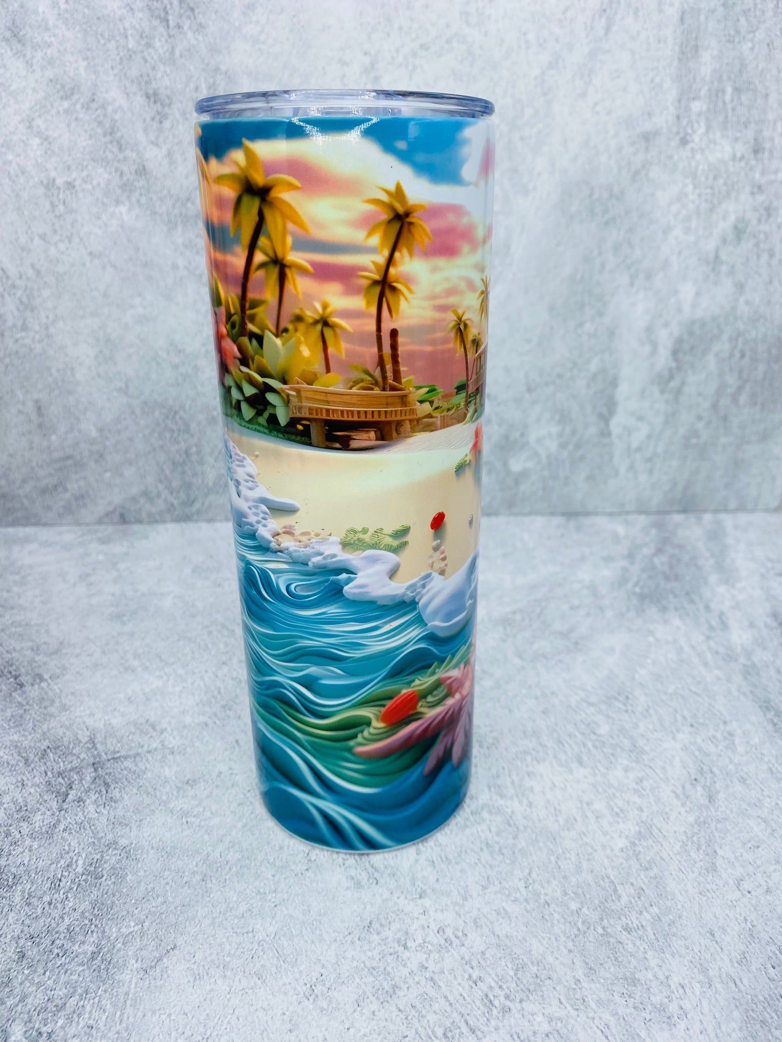 3D Beach Sunset 20 oz  Stainless Steel Skinny Tumbler with lid and straw.