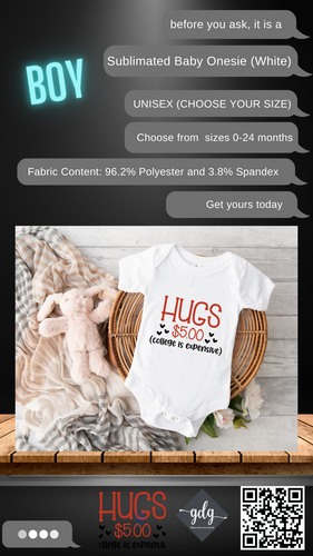 Hugs $500 (college is expensive) (Boys) Sublimated Baby Onesie (Bodysuit) - UNISEX (CHOOSE YOUR SIZE) WHITE ONLY