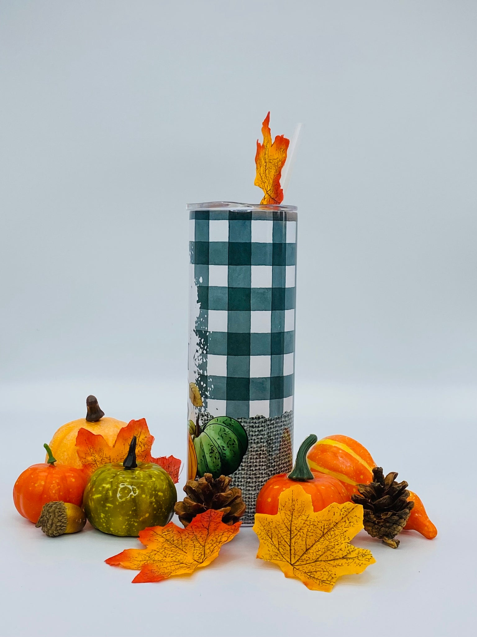 All the plaid and pumpkins and things 20 oz Stainless Steel Skinny Tumbler with straw.